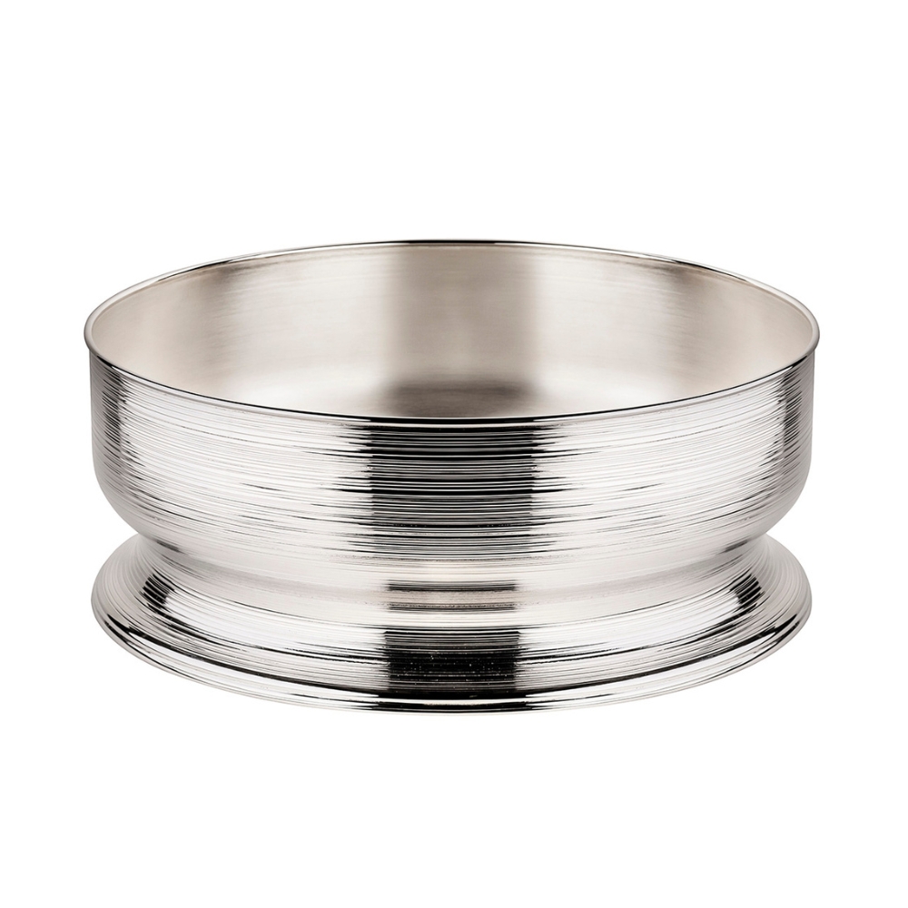O Centro de Mesa Spin Médio Prata da St. James possui formato redondo e riscas esculpidas à mão em toda sua superfície externa. Com seu design moderno, o Centro de Mesa Spin é composto por características que levam delicadeza, luxo e elegância ao seu ambiente.